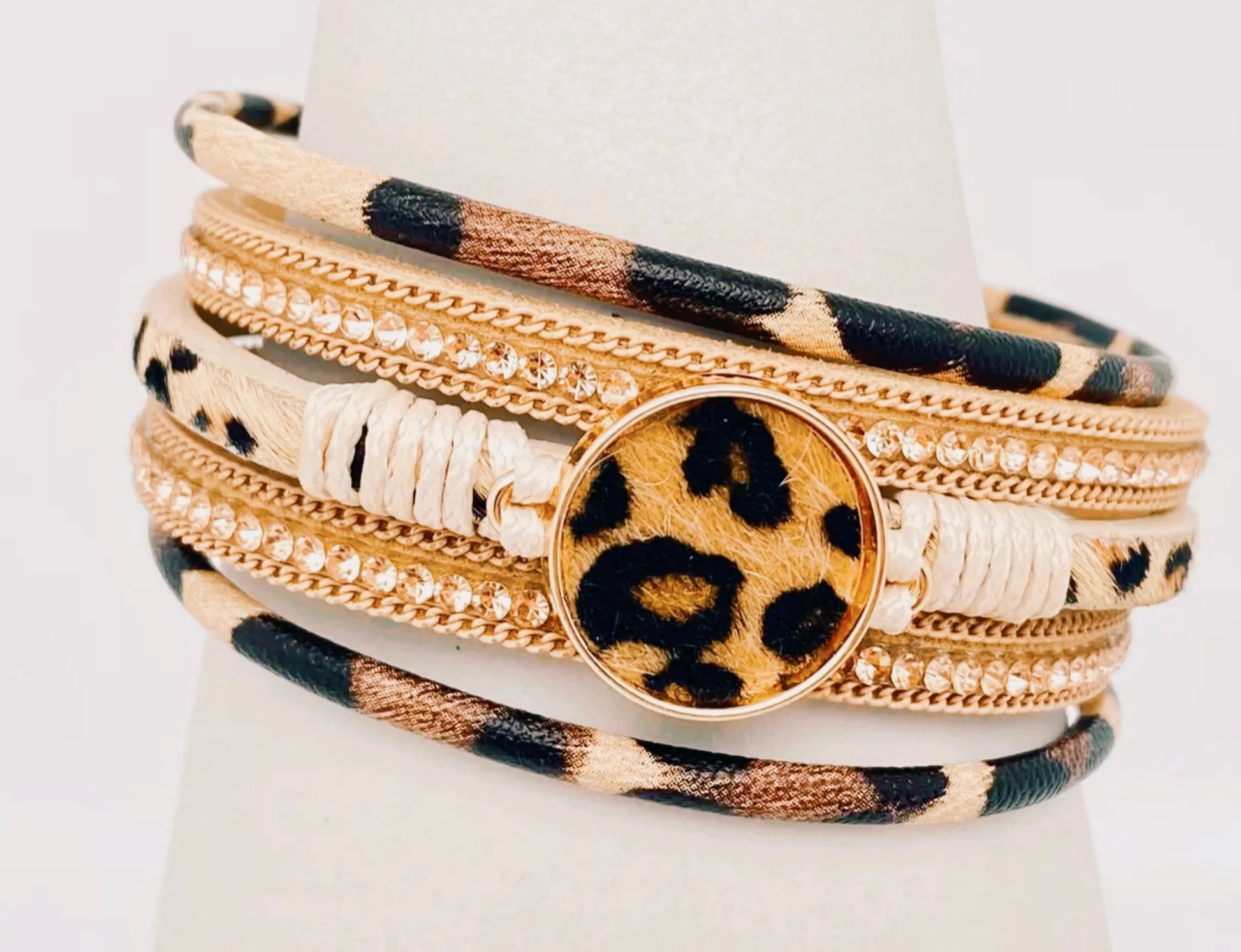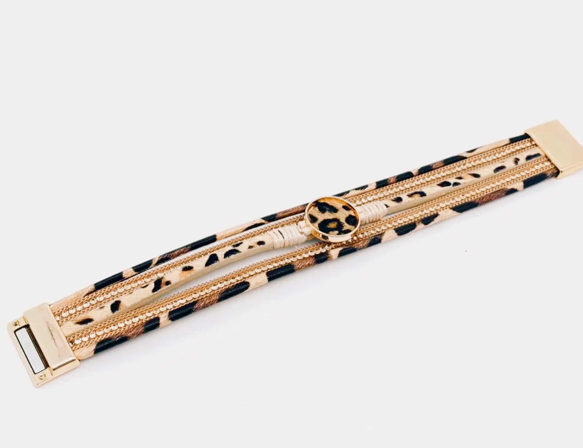 Add a touch of fierce elegance to your outfit with our Leopard Luxe bracelet. Featuring a multi-layer design and a magnetic buckle adorned with a bold leopard print, this bracelet is both functional and stylish. Elevate your look with this luxurious and exclusive accessory.