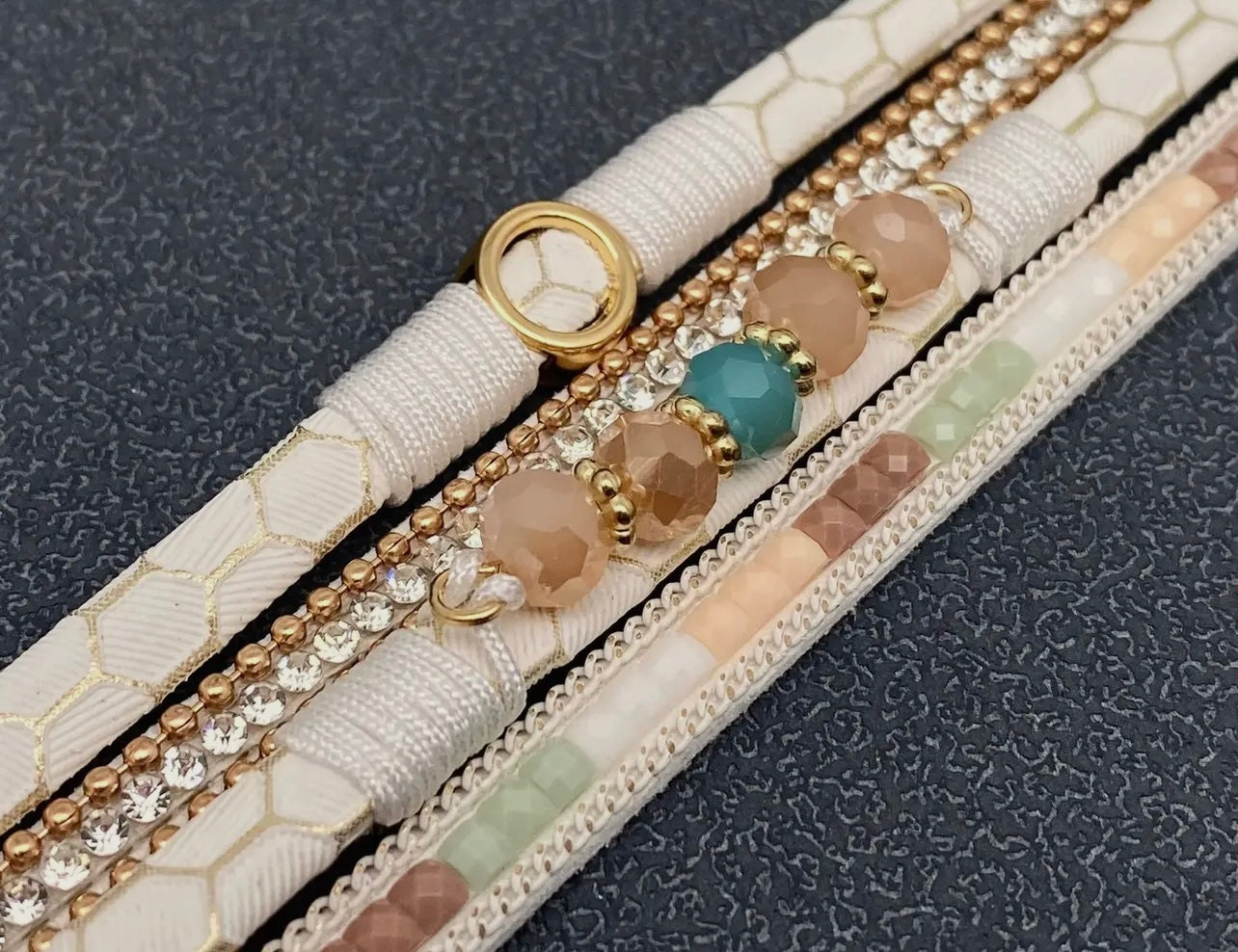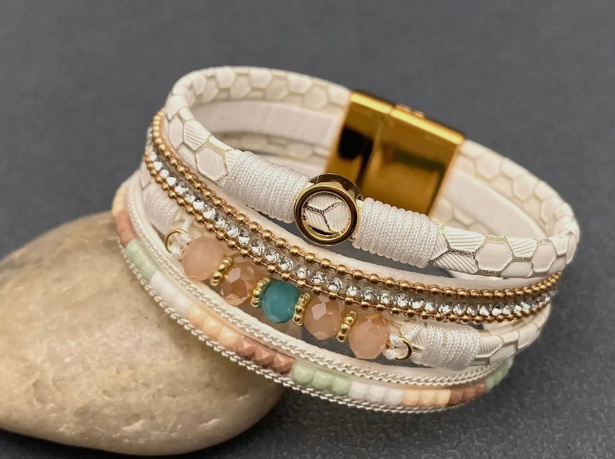 The White Horizon bracelet showcases a refined combination of shimmering rhinestones and layered resin, offering a sophisticated accessory that enhances any outfit. Its multilayer design provides a graceful blend of texture and shine, perfect for adding a subtle yet elegant statement to your look.